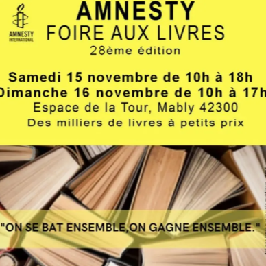 La section roannaise d’Amnesty International vous invite à son annuelle foire aux livres les samedi 15 et dimanche 16 novembre à l'Espace de la Tour. Des milliers de livres à petits prix, et pour tous les goûts !