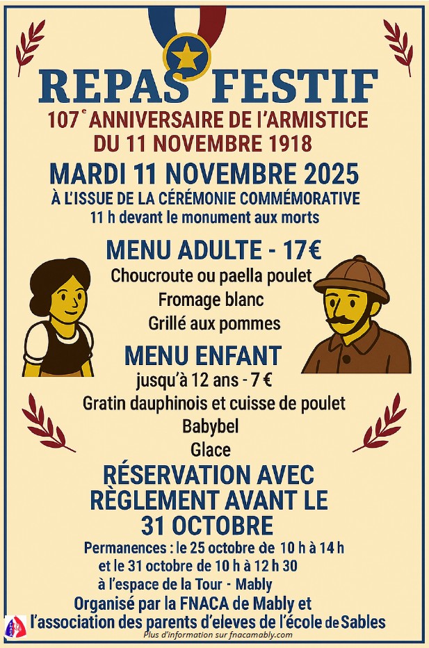 - 11h : Cérémonie devant le monument aux Morts de Mably avec les CM2 des écoles des Sables et le groupe vocal Chorum.